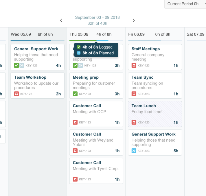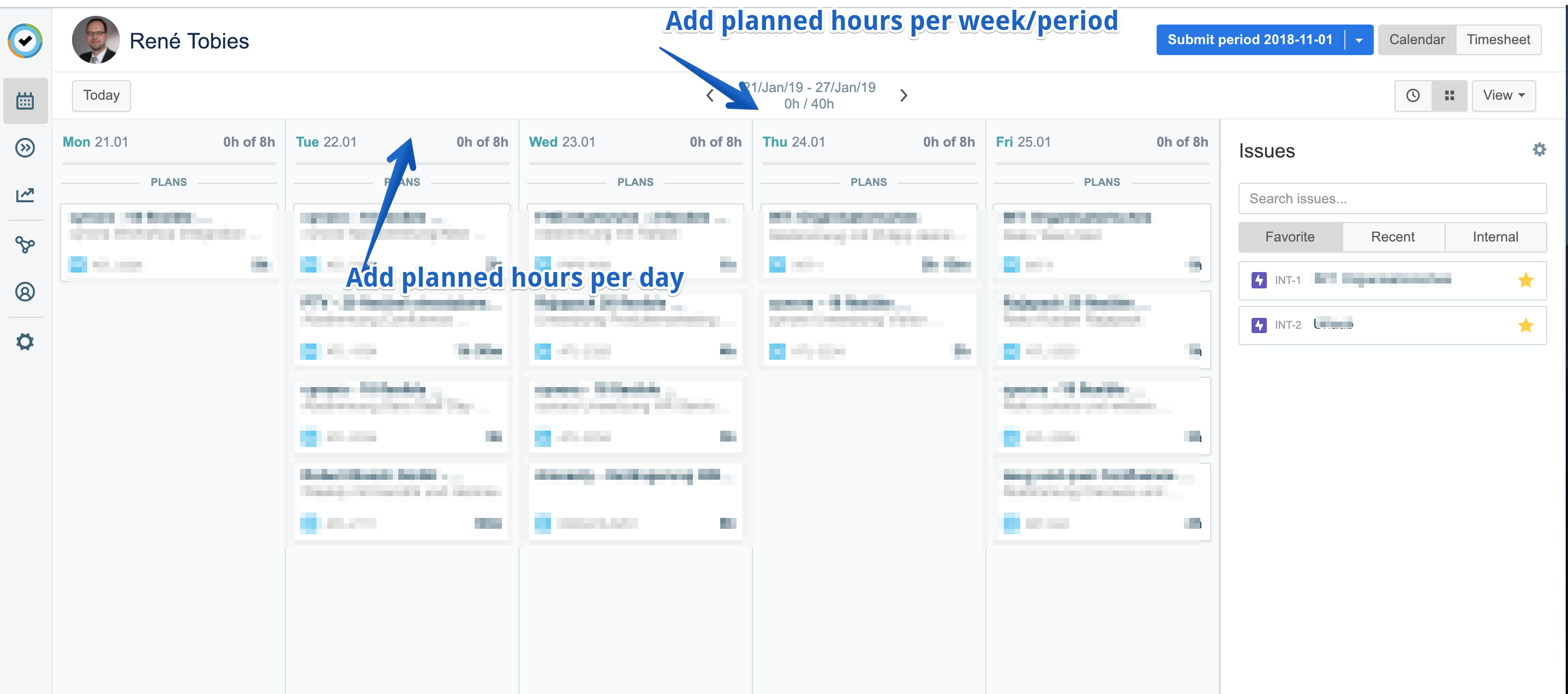 Today I have a suggestion for one of the next versions. Currently the user can't see in this view how much time he has already been planned. It would therefore be very helpful if the sum of the planned hours per day and per selected period could also be displayed. (see attached screenshot)