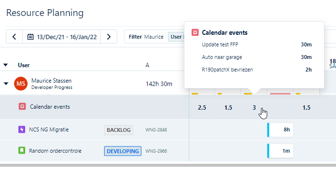 We only see one line of calendar appointments and when hovering over it we see the details.