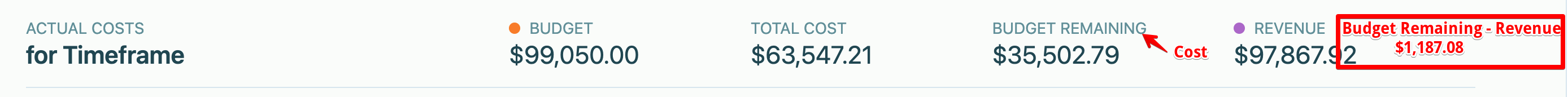 It would be helpful to see budget remaining based on revenue as well as cost. Both of these items are reported on within our agency