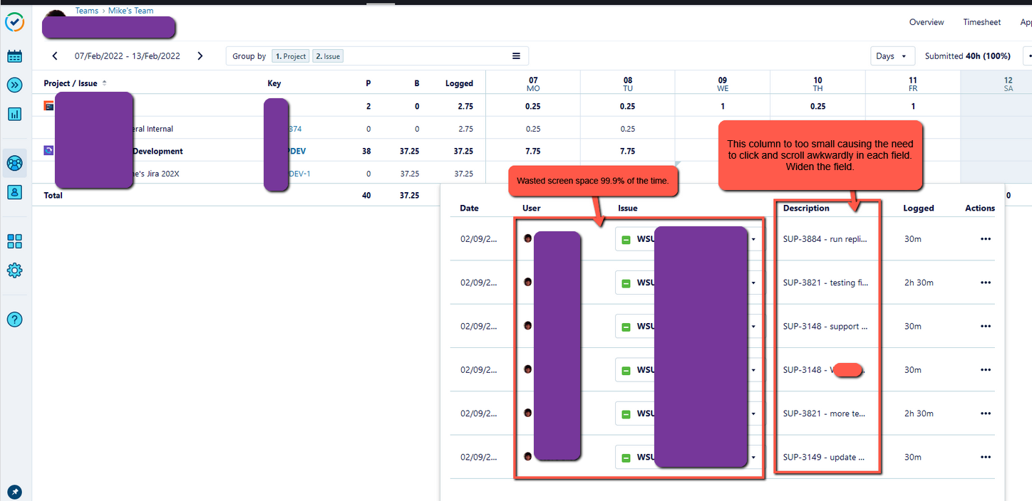 See screenshot. In timesheet approvals, widen the Description field for the tabular zoom view so less awkward clicking and scrolling is needed. Better yet, allow user to hide columns to free up real estate.