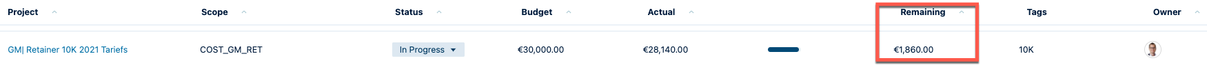 There is shown Budget, Total Cost (Internal) Budget Remaining and revenue.