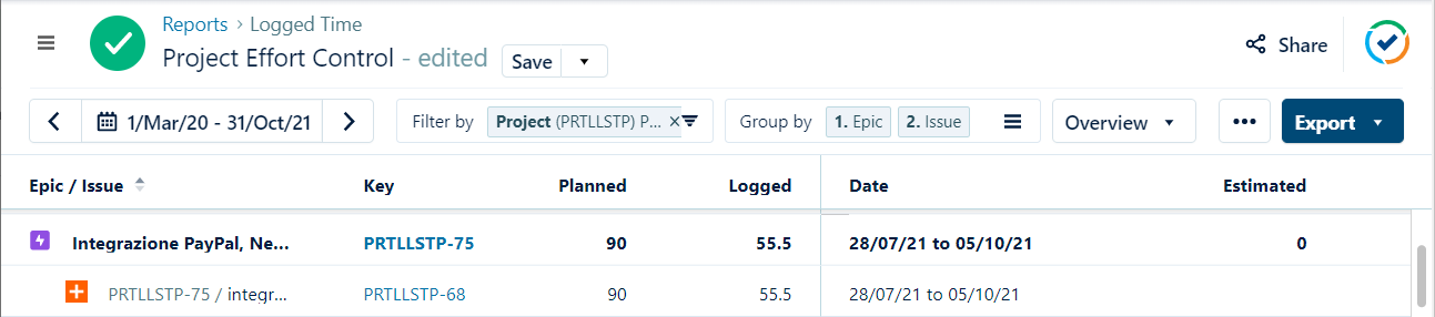 Current behavior: as project manager, I have defined an original estimate on an epic containing multiple tasks. The original estimate represents (in practice) the effort budget available to execute all the tasks contained below the epic itself. The team logs the effort only on the tasks contained below the epic. In the Logged Time Report, on the epic, is visible the total effort logged both on the epic and on the child tasks; the Estimated effort (original estimate) on the epic is visible only if there is at least 1m LOGGED on the epic itself. In the case visible in the attached screenshot, Estimated apparently is 0, even if actually I have an original estimate of 45 days.