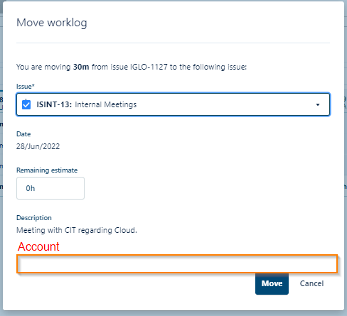 Please insert the Account field to the "Move Worklog" dialog so users can change the Account if needed while moving the time to another project.