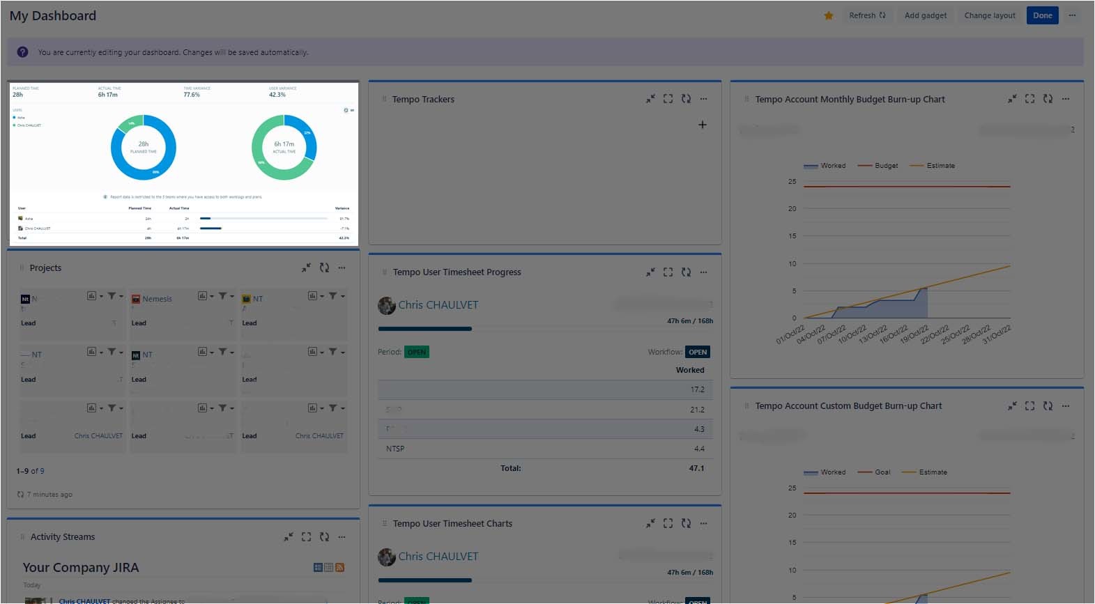Tempo Report Widgets for Jira Dashboards (Logged time, Planned Time and Planned vs Actual)