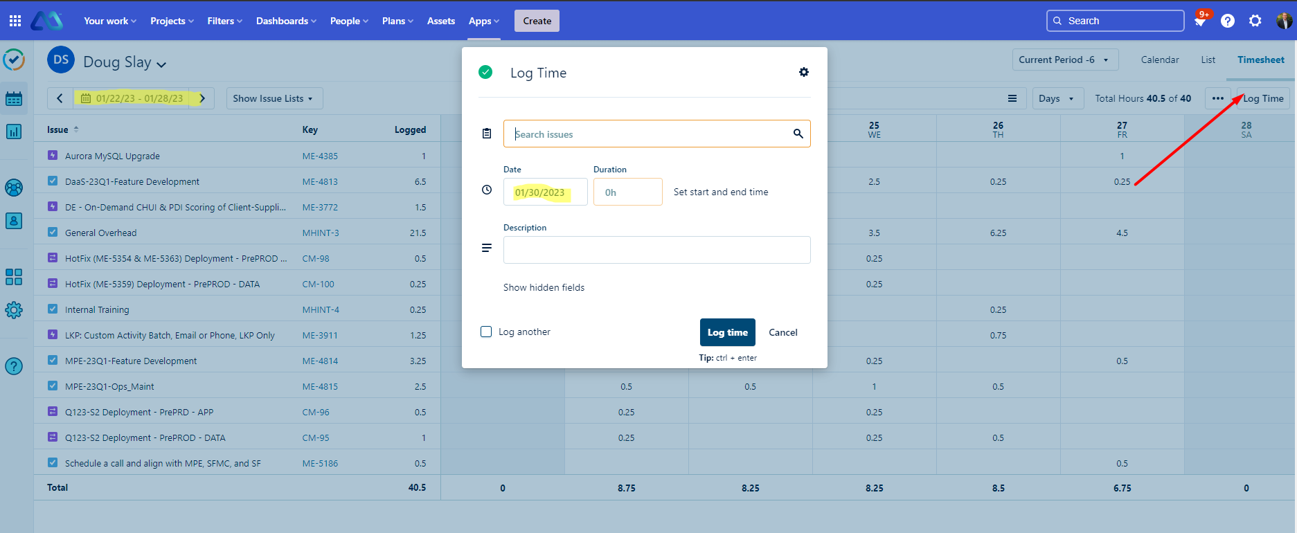 When logging time on the Timesheet view, if the user has selected a previous time period and clicks the "Log Time" button, the popup defaults to the current date even though the user is expecting to log time to a previous week.