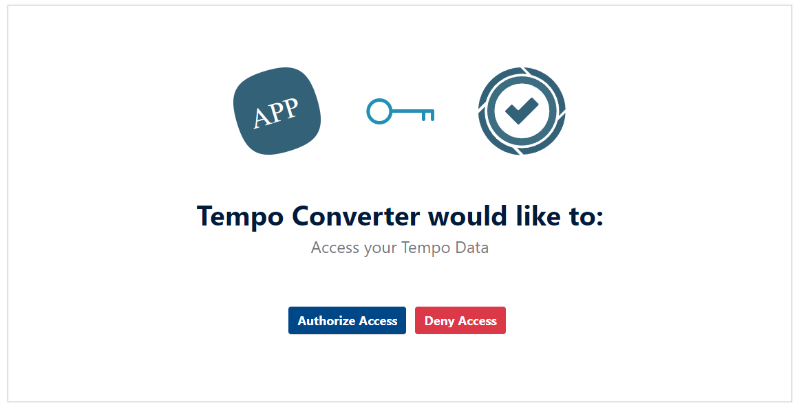 In the OAuth authorization stage, the user sees a page with an app icon, a key, and the Tempo icon. And the name of the app and controls below.