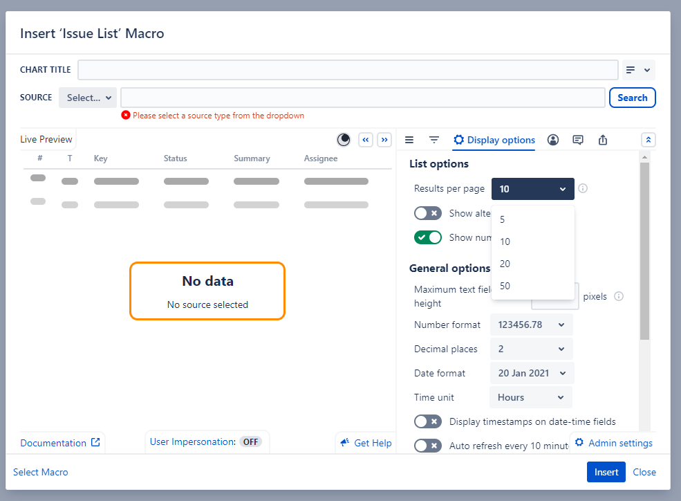As a Confluence user, I would like to be able to freely select the "results per page" of the "Custom Jira Charts - Issue List" macro in order to display more than 50 lines per page if necessary.