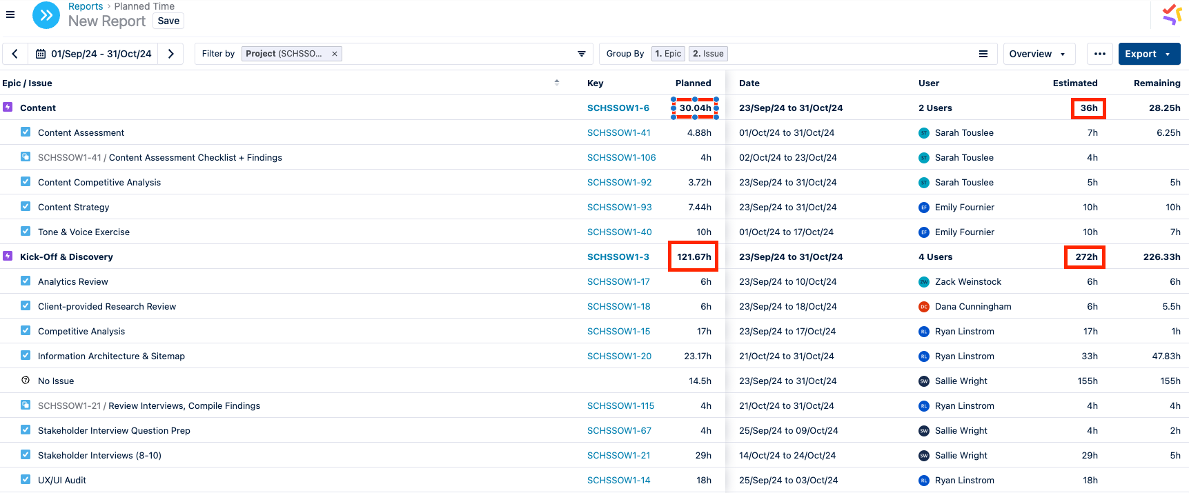 Screenshot attachment shows the boxes in red as the sum of the tasks, NOT what the Original Estimate is of that epic from Jira. (Note: the Planned column also isn't accurate from what the Jira Original Estimate field is in the epic) Example from screenshot: "Kick-off & Discovery" epic has 155h in the Original Estimate field, but in the screenshot, Planned column says 121.67h and Estimated field says 272h. I've tried adjusting the timeframe to full length of the project and it also didn't report properly