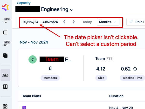 Hi Tempo team! We have started using the Tempo Planner tool heavily for engineering teams at our company, and I'd like to request a minor amendment if possible. Usually, we plan our releases, and the start/end dates are not the same as 1st and last day of the month/quarter/etc... On the Team's capacity view, we can select only weeks, months and quarters, and the date picker isn't clickable as it is for the individual resources view. That means if we need to understand our team's capacity for the custom period, the only way to achieve this is to change dates in URL parameters. If you could add an option to select a custom period using the date picker, it would help us a lot!