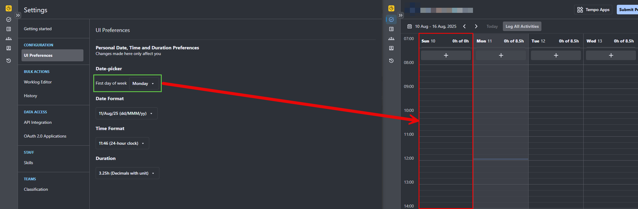 Under Settings -> Configuration -> UI Preferences -> Date-Picker, the first day of the week can be set to either Sunday or Monday.