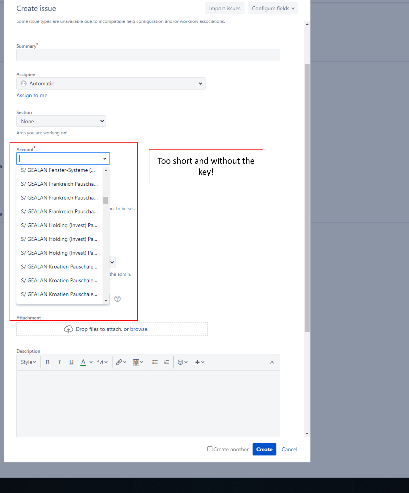 Please enlarge the account field on the issue screen and enable a standard length including the key!