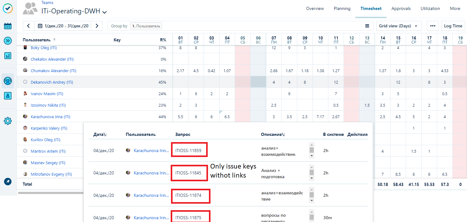 Grouping timesheets by the issues might be irrelevant when it comes to cases with large timesheets. So adding the links will allow to get more convenient timesheet analysis.