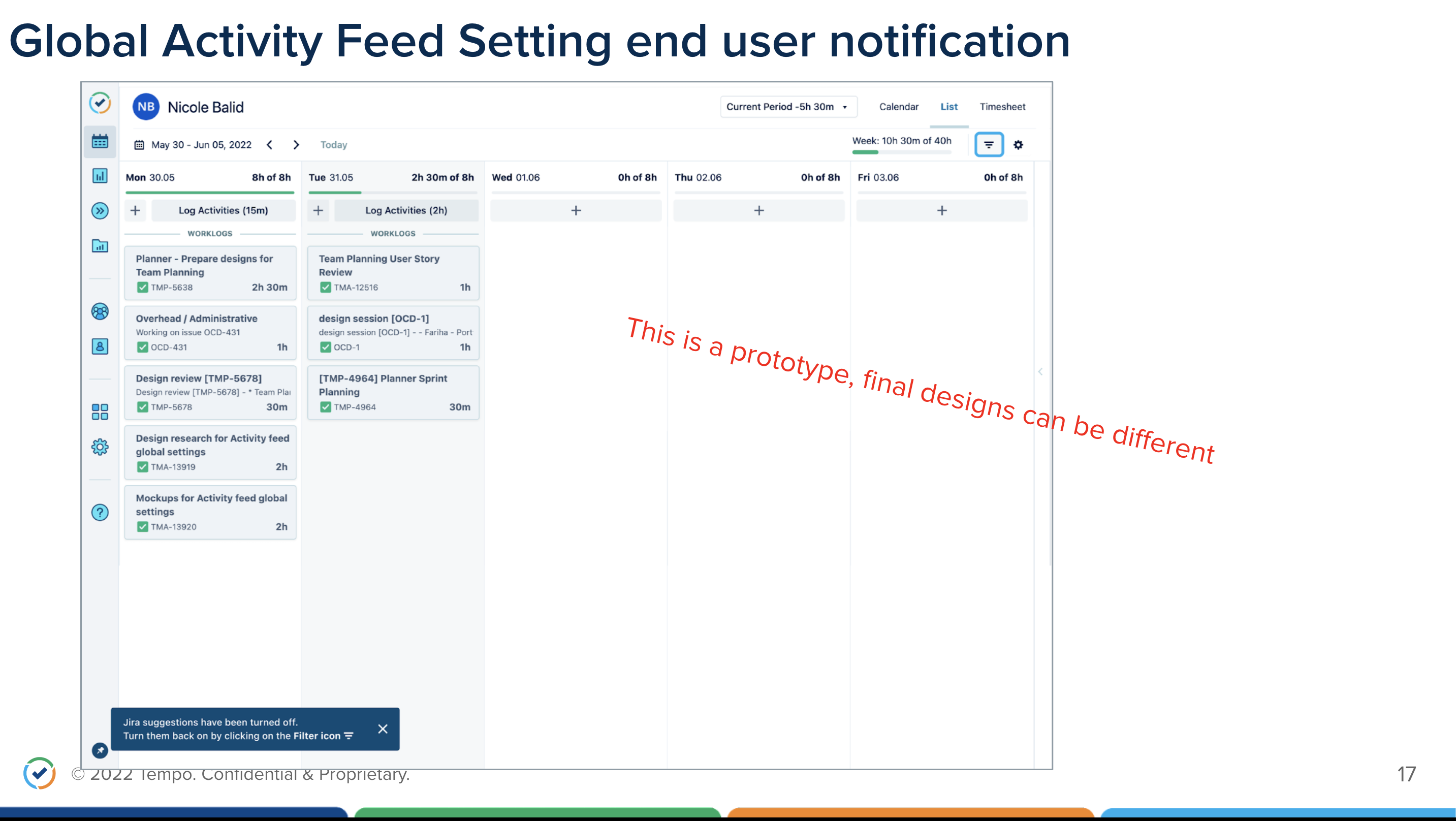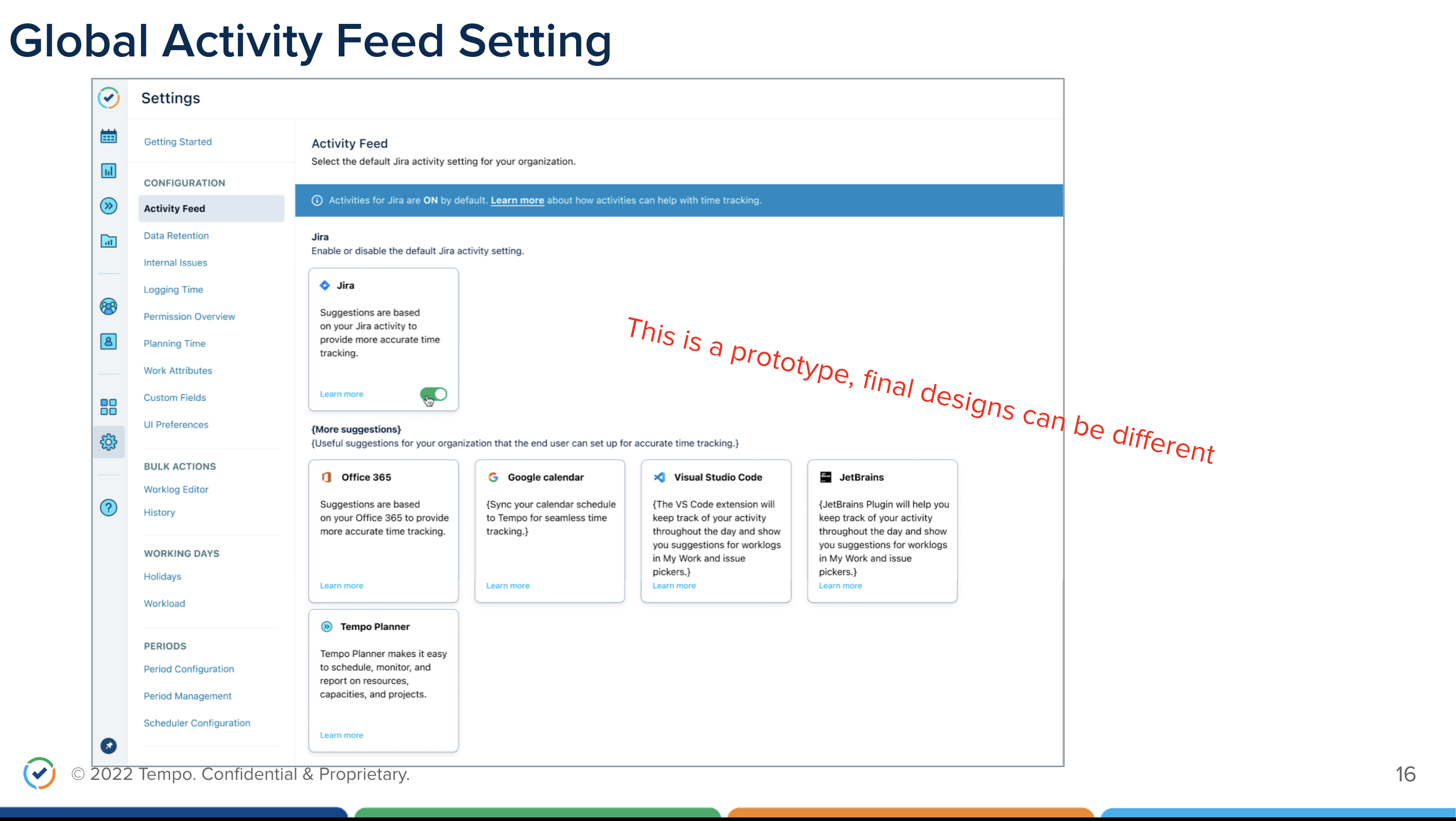 Hi, Global activity feed toggle is shipped! This feature allows Tempo Admins to choose the default behaviour of the Jira Suggestions (part of Activity Feed Feature) for end users. End users can still choose to use Jira suggestions for time tracking but default behaviour can be controlled in the settings now. Learn more here.